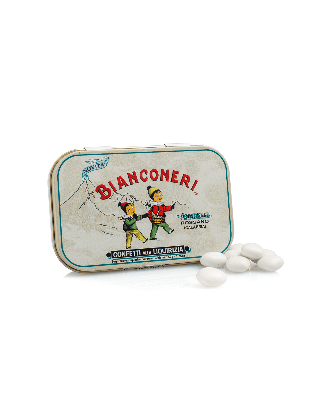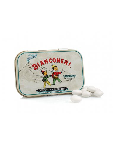 La liquirizia Amarelli Bianconeri alla menta in lattina da 40 g. confetti di liquirizia alla menta ricoperti di zucchero.