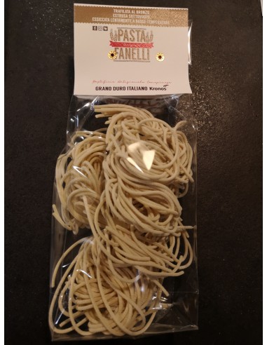 I pici della Tuscia Kronos è una pasta di grano duro che ha una tenuta ottimale in cottura, porosità e gusto inconfondibile. La continua ricerca di materie prime di alta qualità ci ha portato a conoscere e selezionare le migliori semole di grano duro coltivate in Italia. Per l'ottimale tenuta in cottura abbiamo scelto il grano duro Kronos, un grano unico per tenacità, sapore e colore. Originario degli Stati Uniti ed attualmente coltivato e trasformato in Italia, da sempre tra i grani utilizzati dagli storici pastifici artigianali per la produzione di paste sempre al dente. La semola ottenuta dalla sua macinazione si contraddistingue per l'alto contenuto proteico, per il colore giallo intenso, ma soprattutto per la tenacità del suo glutine, cioè la tenacità di resistere alla cottura.