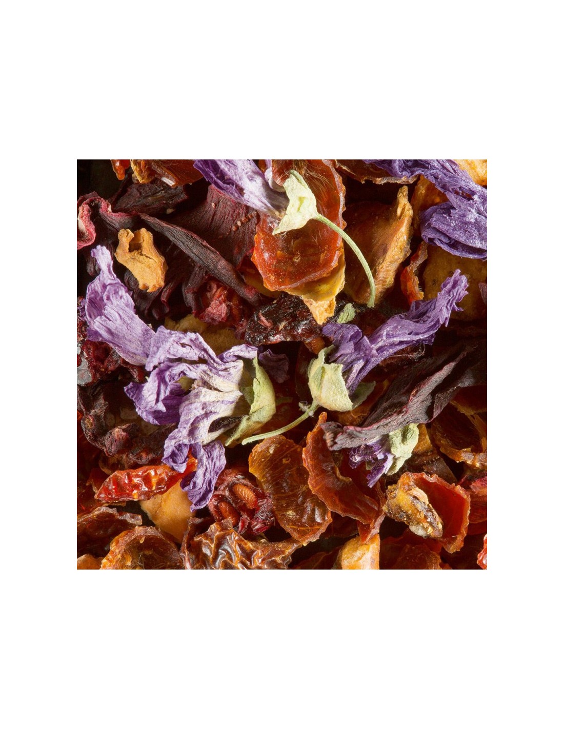 Ingredienti: Scorze di rosa canina, pezzi di mela, fiori di ibisco, aromi (lampone, frutto della passione)