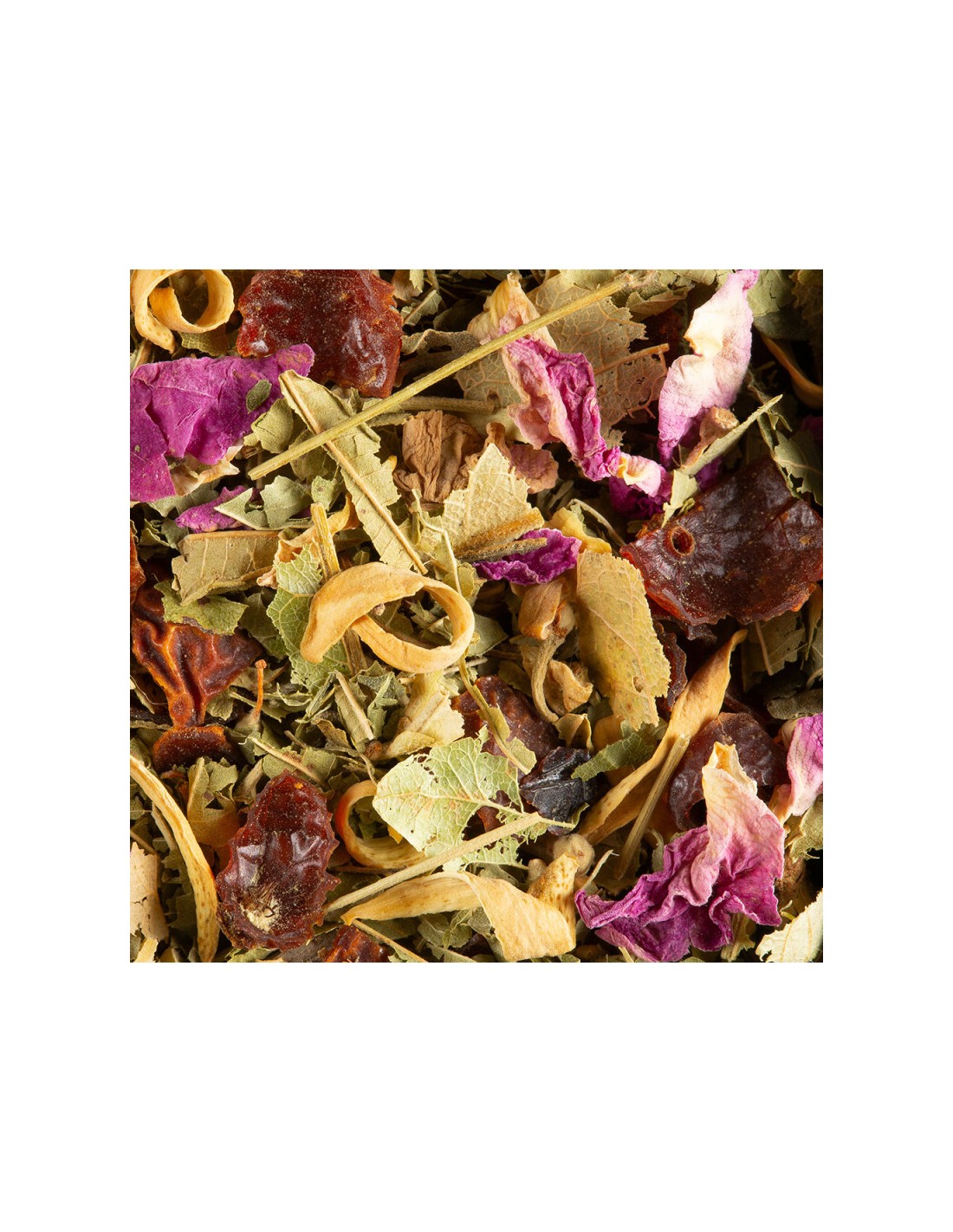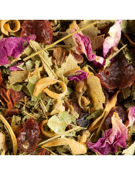Ingredienti: Scorze di rosa canina, verbena, tiglio, petali di fiori, aromi (bergamotto, kiwi, fiori d'arancio, violetta, pesca)