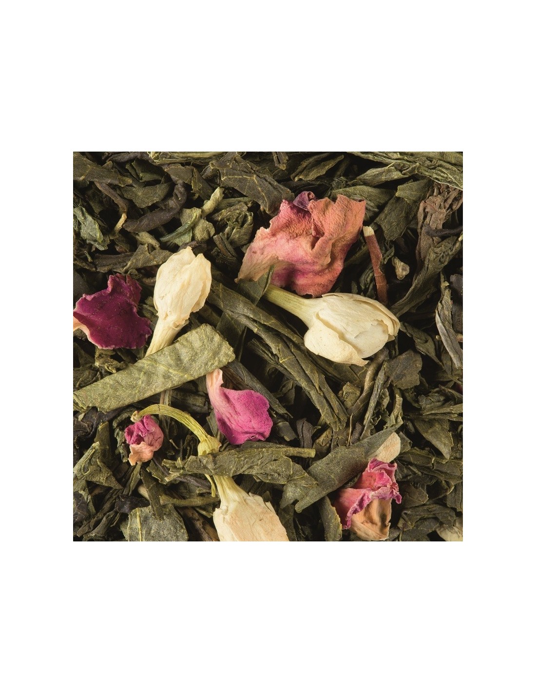 Ingredienti: Tè verde, tè verde al gelsomino, petali di fiori, aromi (litchi, pompelmo, pesca sanguigna) e olio essenziale di rosa